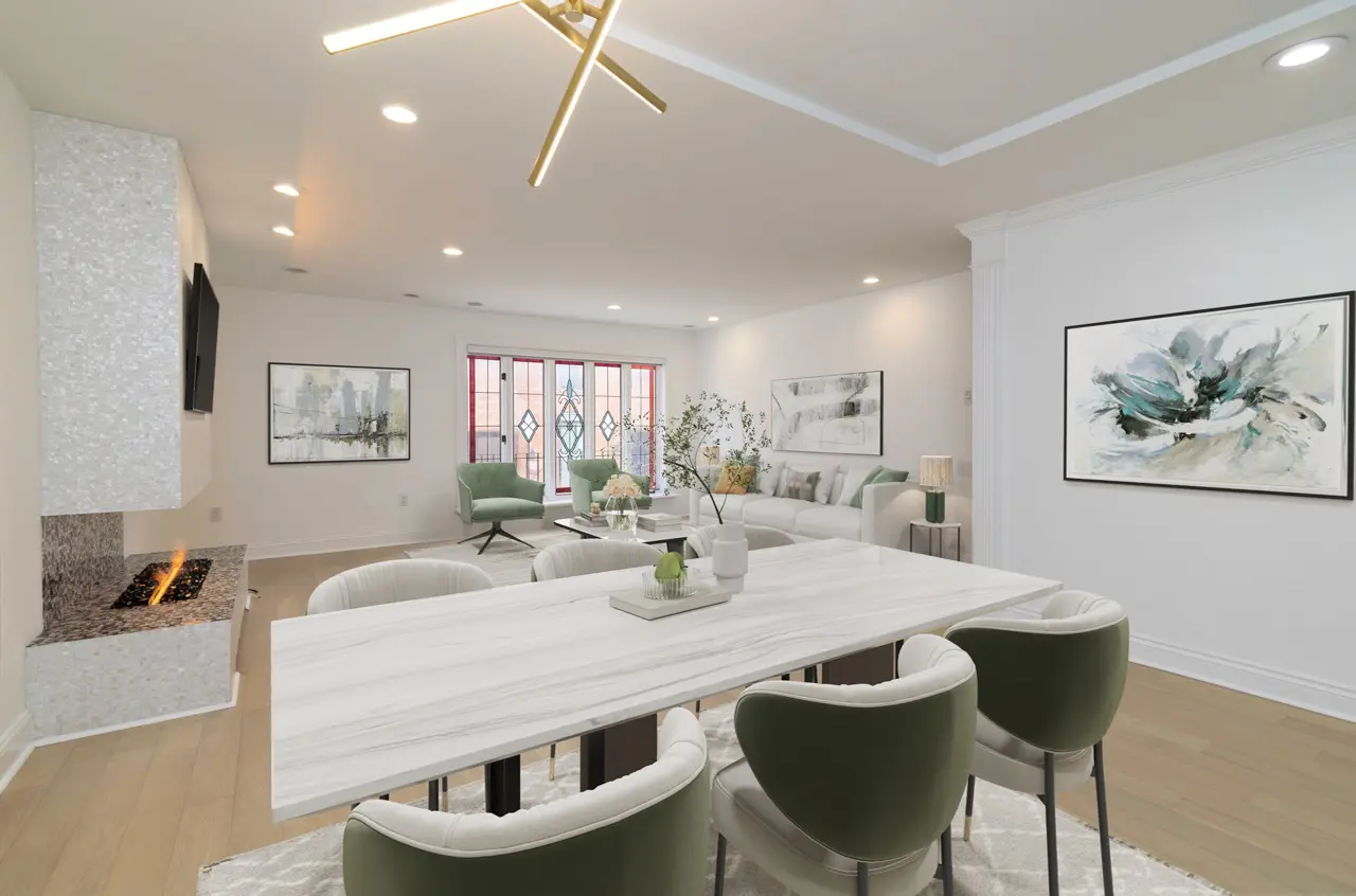 Upstairs, the main level stuns with floor-to-ceiling windows, brand-new hardwood flooring, and an open layout that blends function and style. The sleek kitchen is outfitted with a high-end Thermador appliance package, pantry storage, and a seamless flow to your tranquil backyard oasis complete with built-in planters and mature trees. The living area includes a Juliet balcony, steam-powered fireplace for ambient warmth, and integrated speaker system—all managed through a full smart home setup.