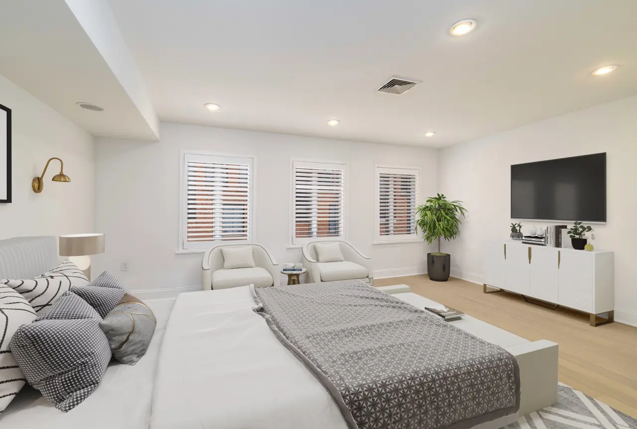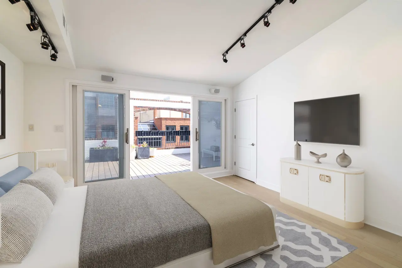 The top level features a second primary suite with its own walk-in closet (flexible as a nursery or office) and direct access to a private roof deck—ideal for morning coffee