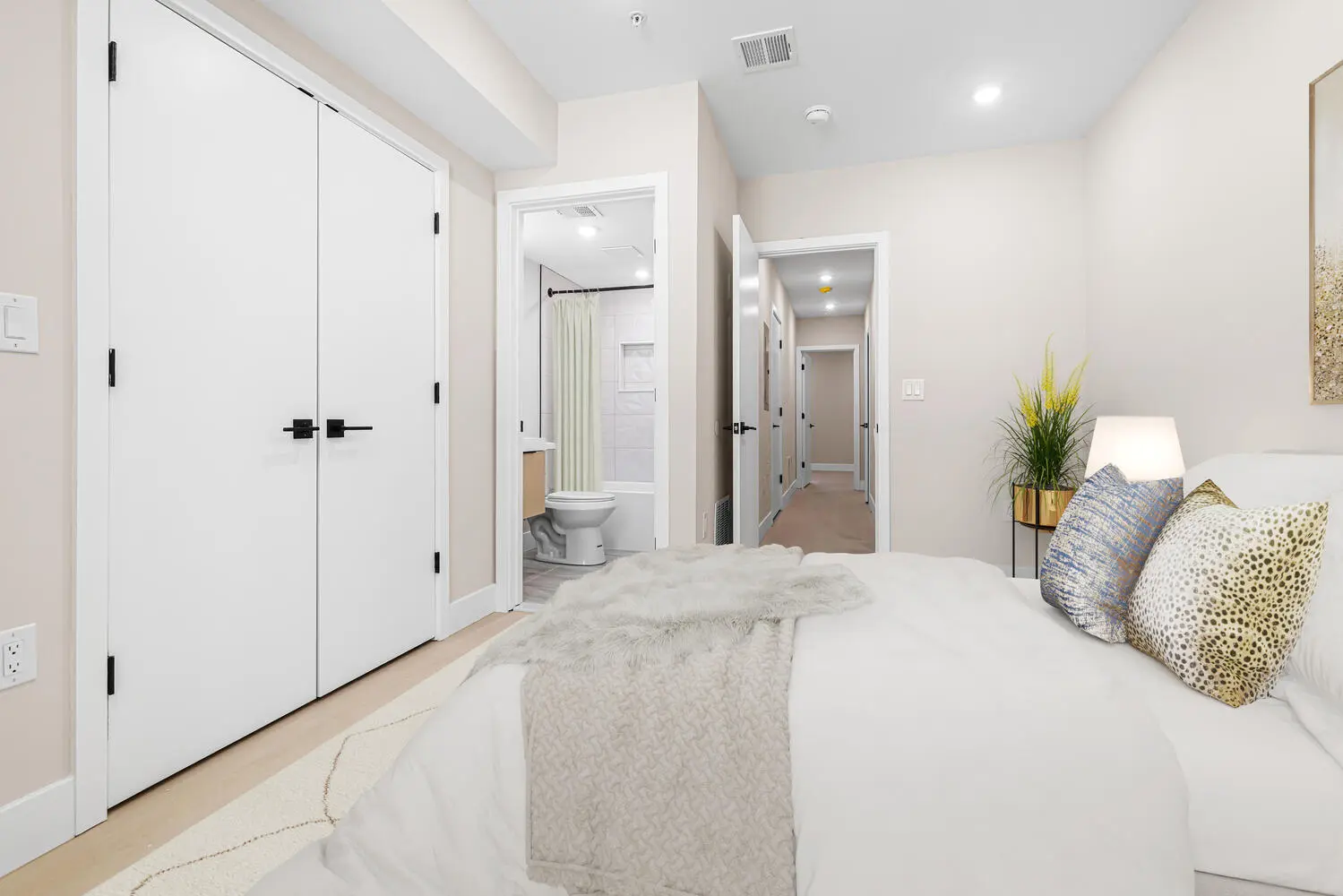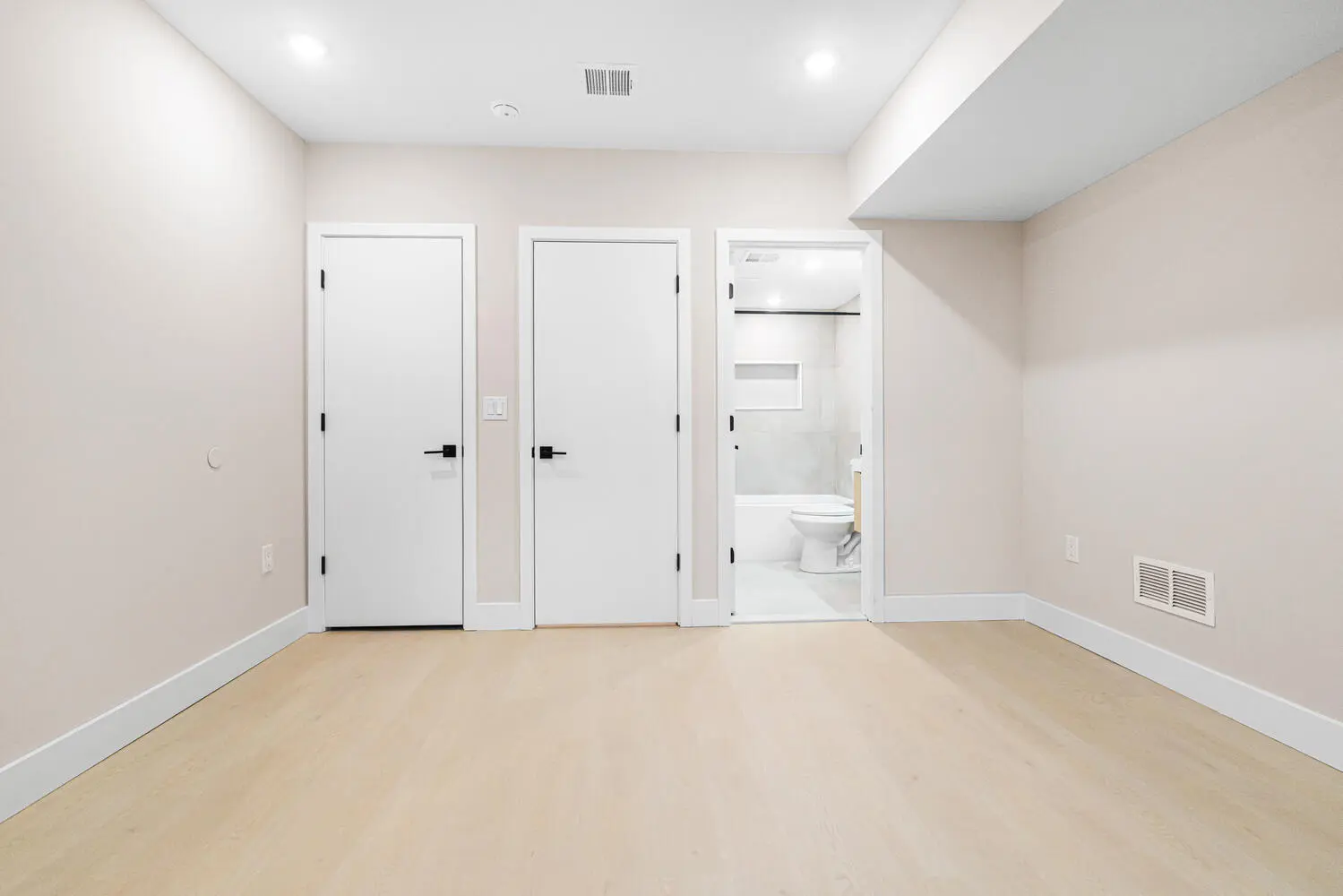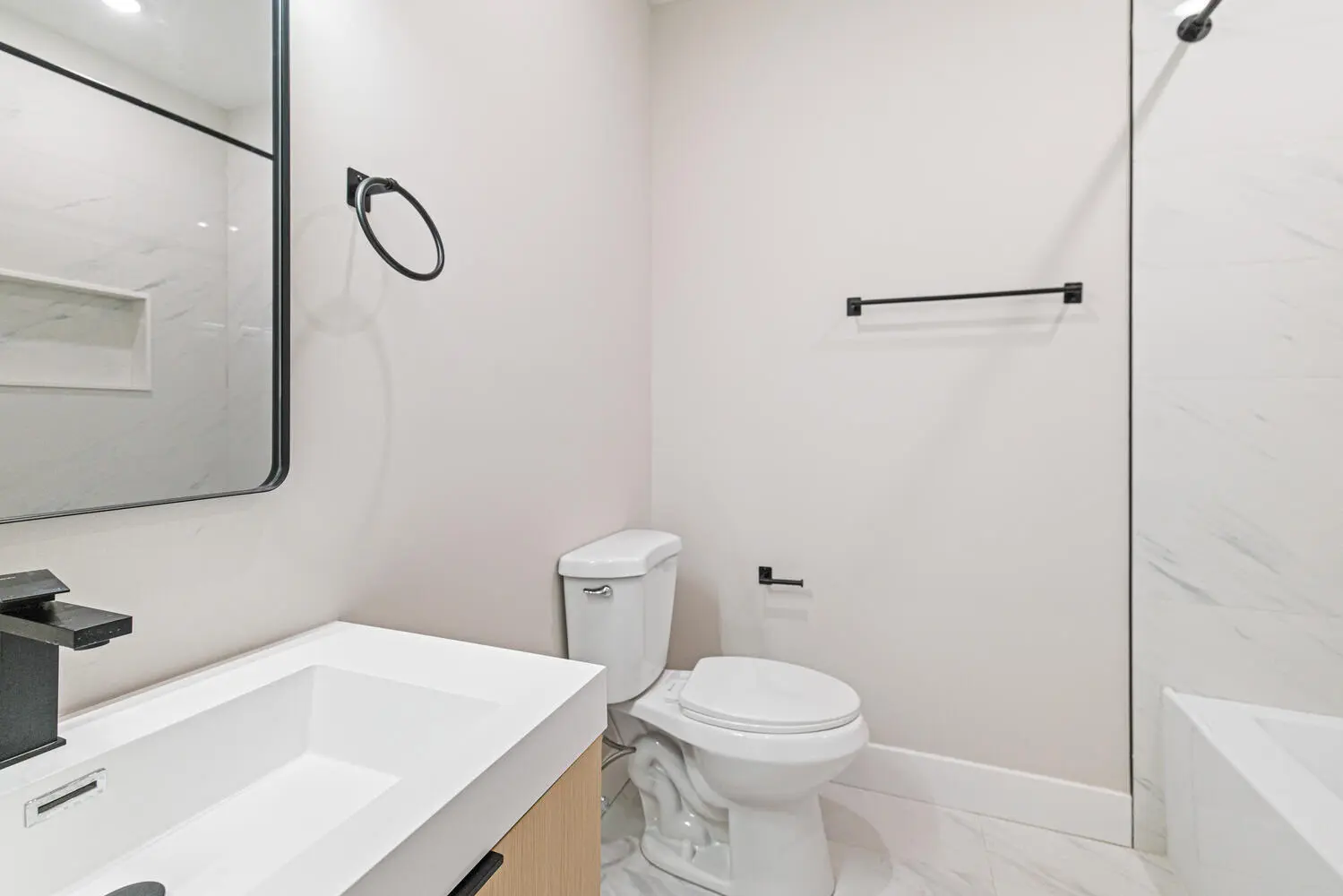 Unit A is a spacious bi-level residence featuring a bright front room with oversized windows, a full bath with floating vanity and rainfall shower, an open L-shaped kitchen with stainless steel appliances and counter seating, and a generous living area that opens to a large private backyard. The finished lower level offers two bedrooms, each with its own en-suite bath and closet, plus in-unit laundry.