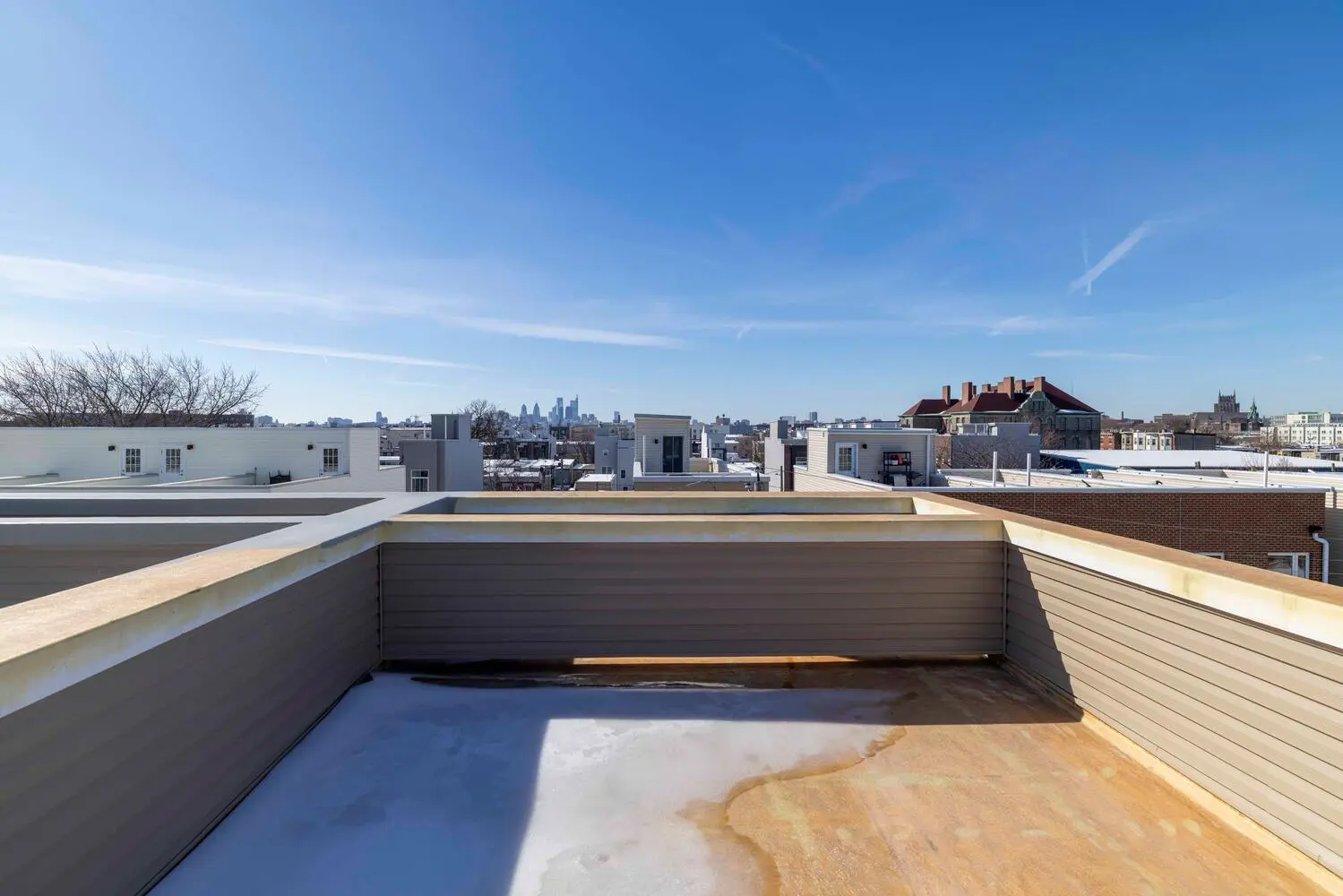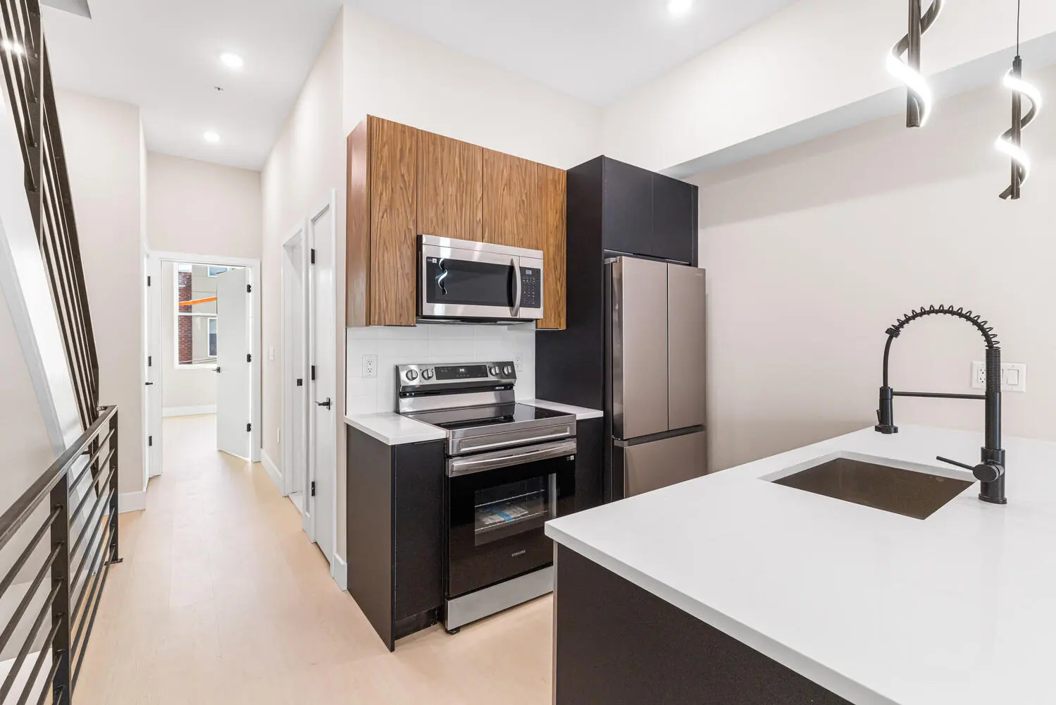 Unit B spans multiple levels and offers a modern galley kitchen with stainless steel appliances and designer pendant lighting, an open living and dining area with access to a private balcony, and multiple well-sized bedrooms with ample closet space. Upper levels include additional full baths, laundry, and access to a private roof deck with impressive city skyline views.