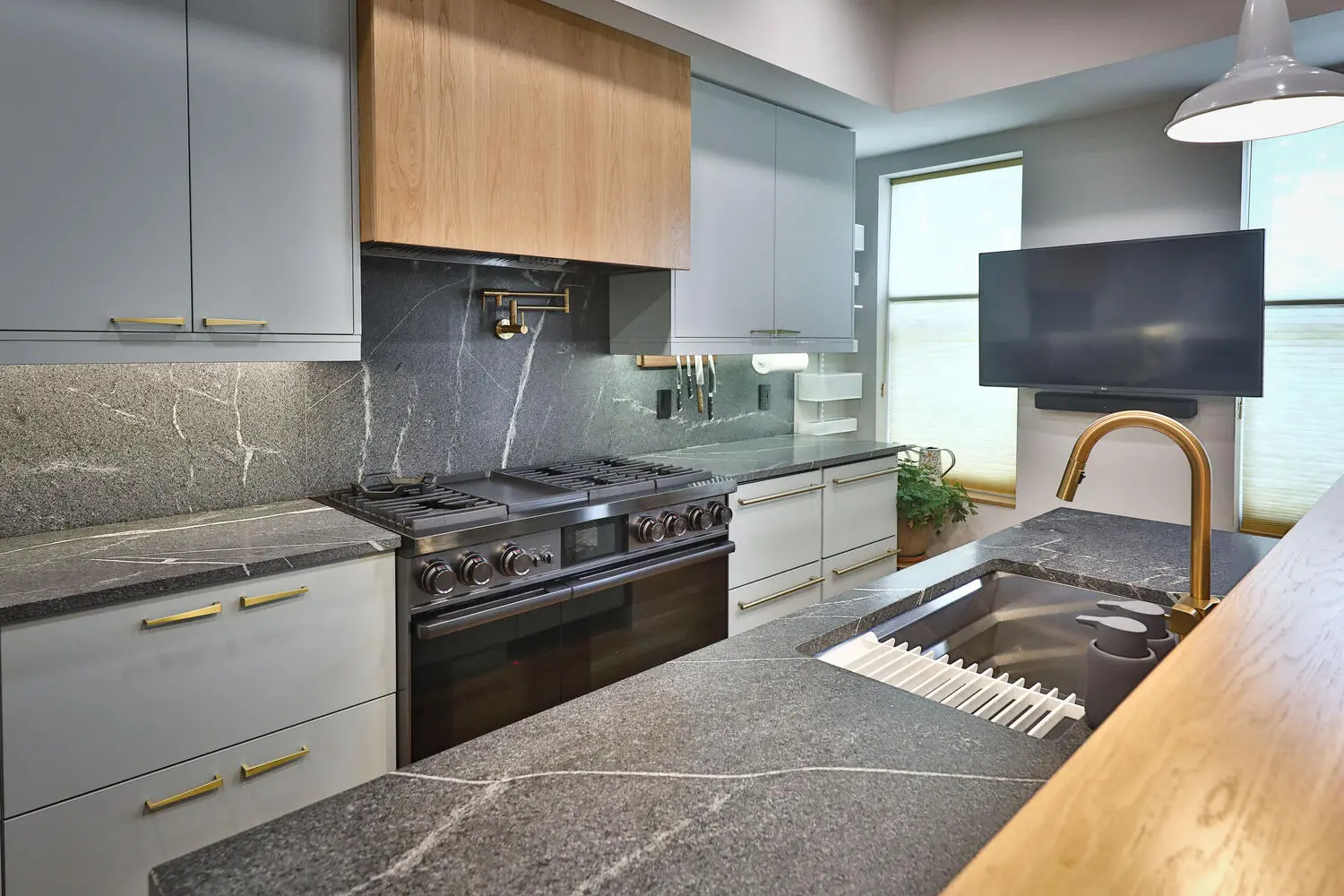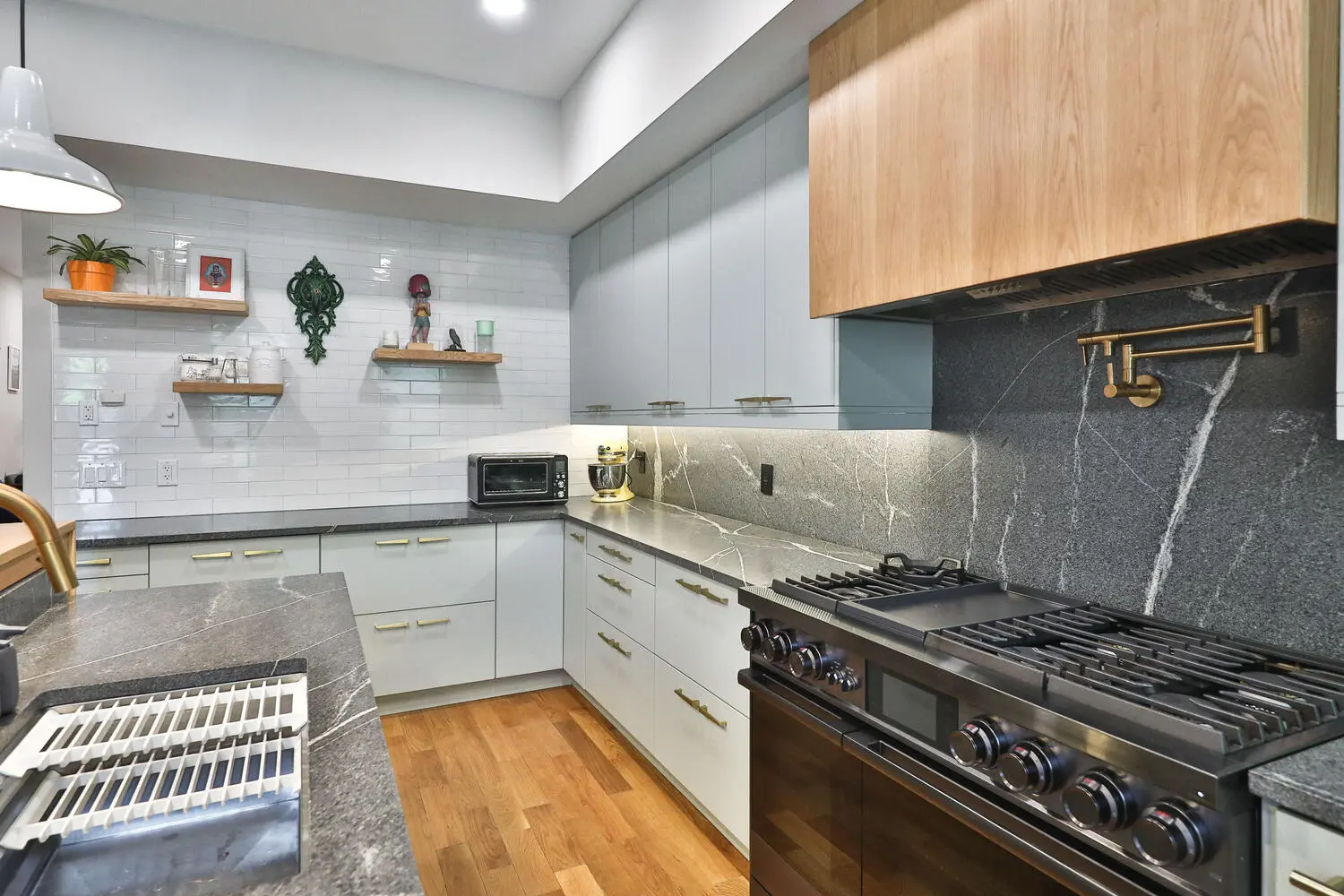 Step inside to a gourmet chef’s kitchen that is both bold and elegant, featuring striking granite countertops, custom gray cabinetry accented with gold fixtures, high-end black Dacor appliances—including a double oven and steamer—plus a seamlessly integrated refrigerator. A white oak breakfast nook adds warmth to the space, while the open-concept layout flows effortlessly to the dining area and a sliding door leading to a wraparound deck complete with a built-in speaker system.