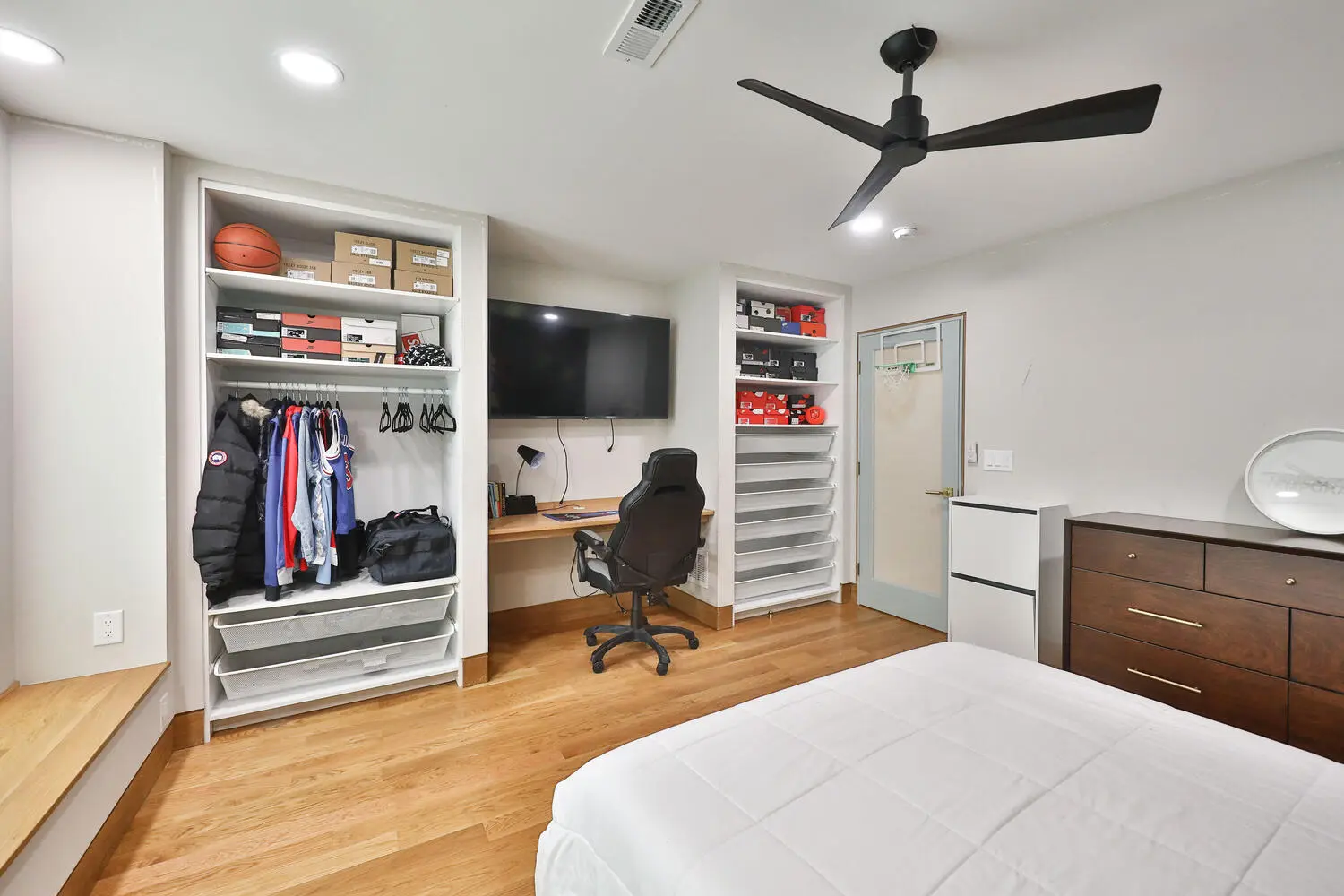 Additional standout features of this exceptional home include built-in speakers throughout, a home surveillance system, recessed lighting, hardwood floors, dimmable light switches, abundant storage, heated flooring in all bathrooms and the basement, ceiling fans in every bedroom, WiFi boosters on each level, custom doors, and dual HVAC systems. TVs and basement freezer are included in the sale.