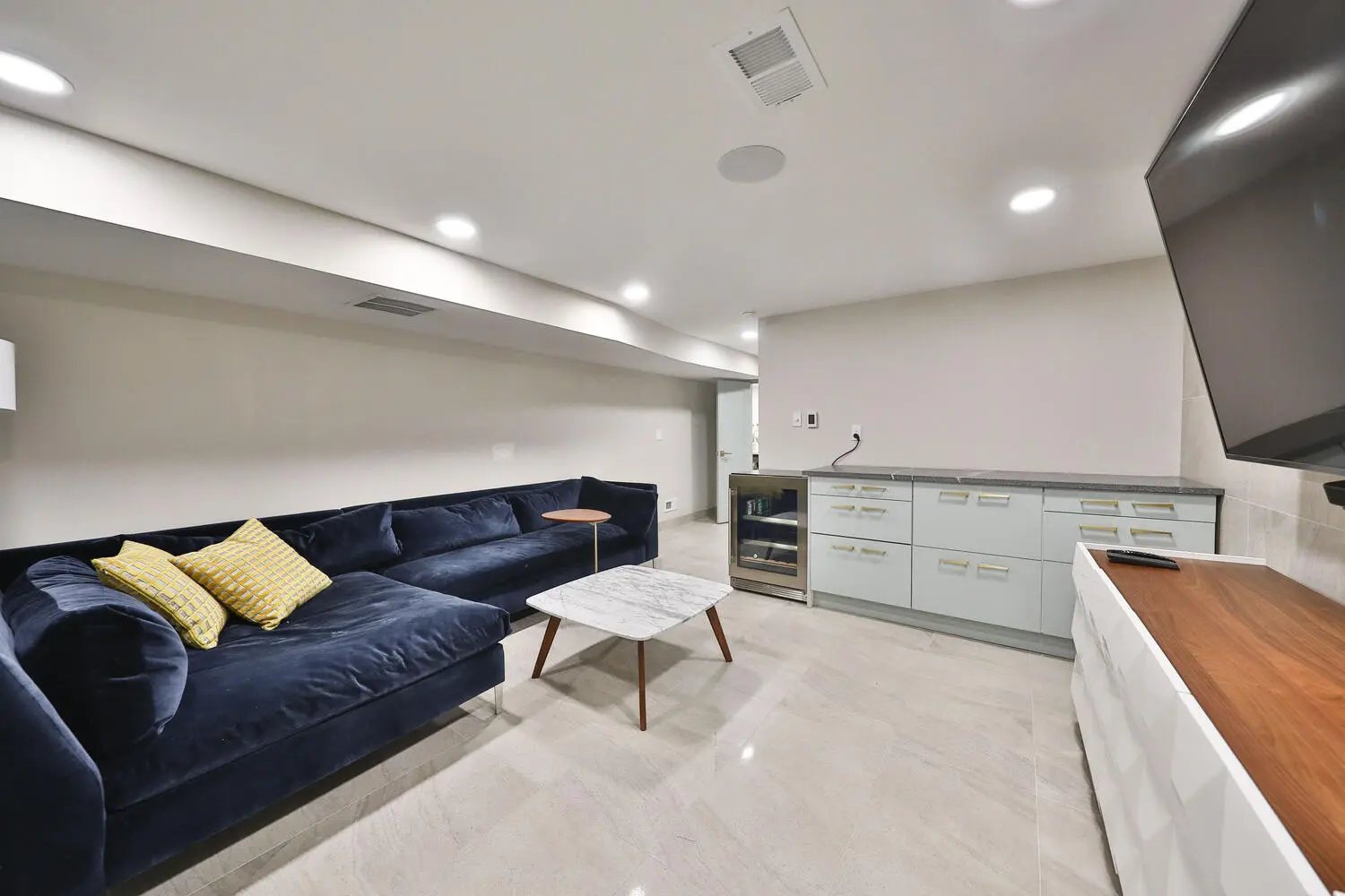 The fully finished basement offers a versatile living space ideal for entertaining, complete with a wine fridge, bar area, and an additional full bathroom.